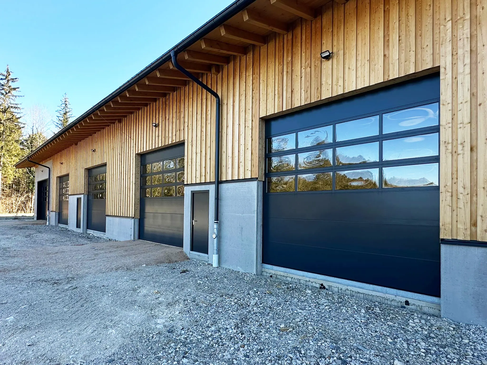 Ein besonderes Augenmerk lag auf den integrierten Sichtsektionen: Diese sorgen für optimalen Tageslichteinfall in den Arbeitsbereichen und ermöglichen gleichzeitig eine bessere Sicht nach außen – ein klarer Vorteil für Sicherheit und Arbeitskomfort im täglichen Betrieb. Zusätzlich wurden Nebentüren eingebaut, um den Zugang auch ohne Toröffnung zu gewährleisten.
