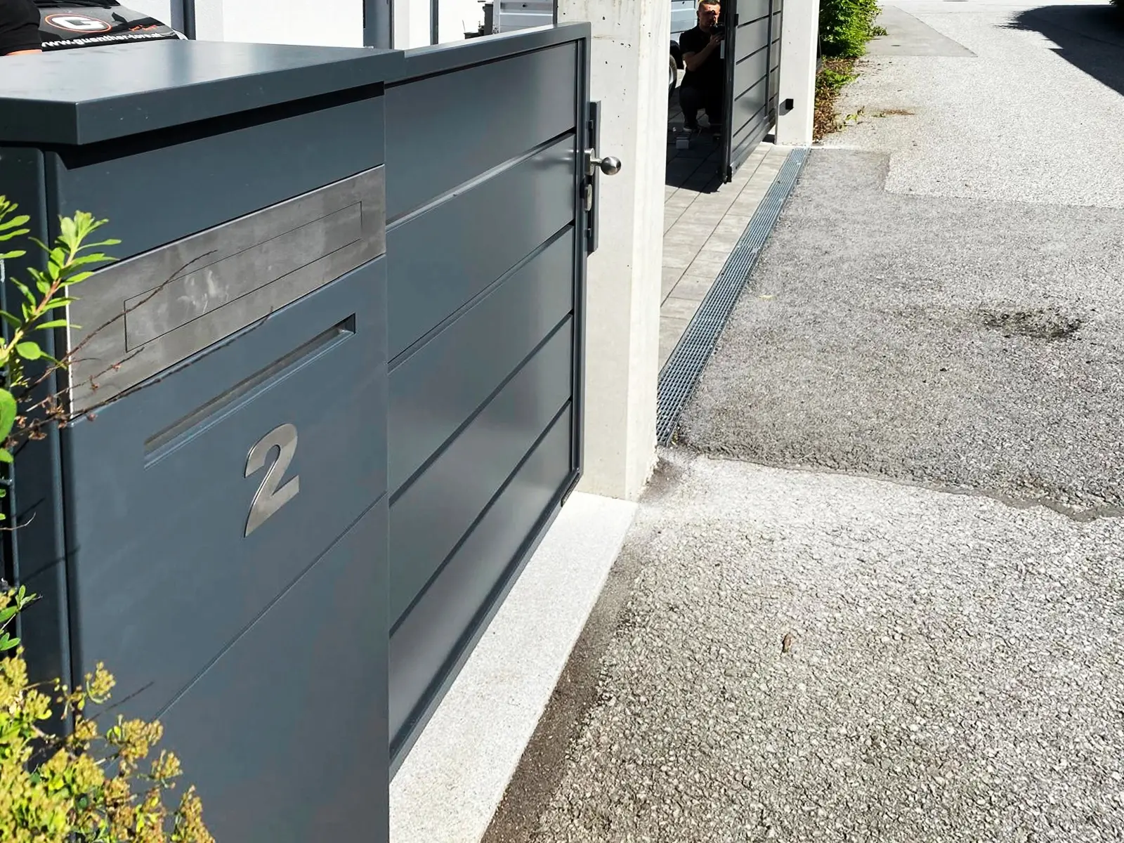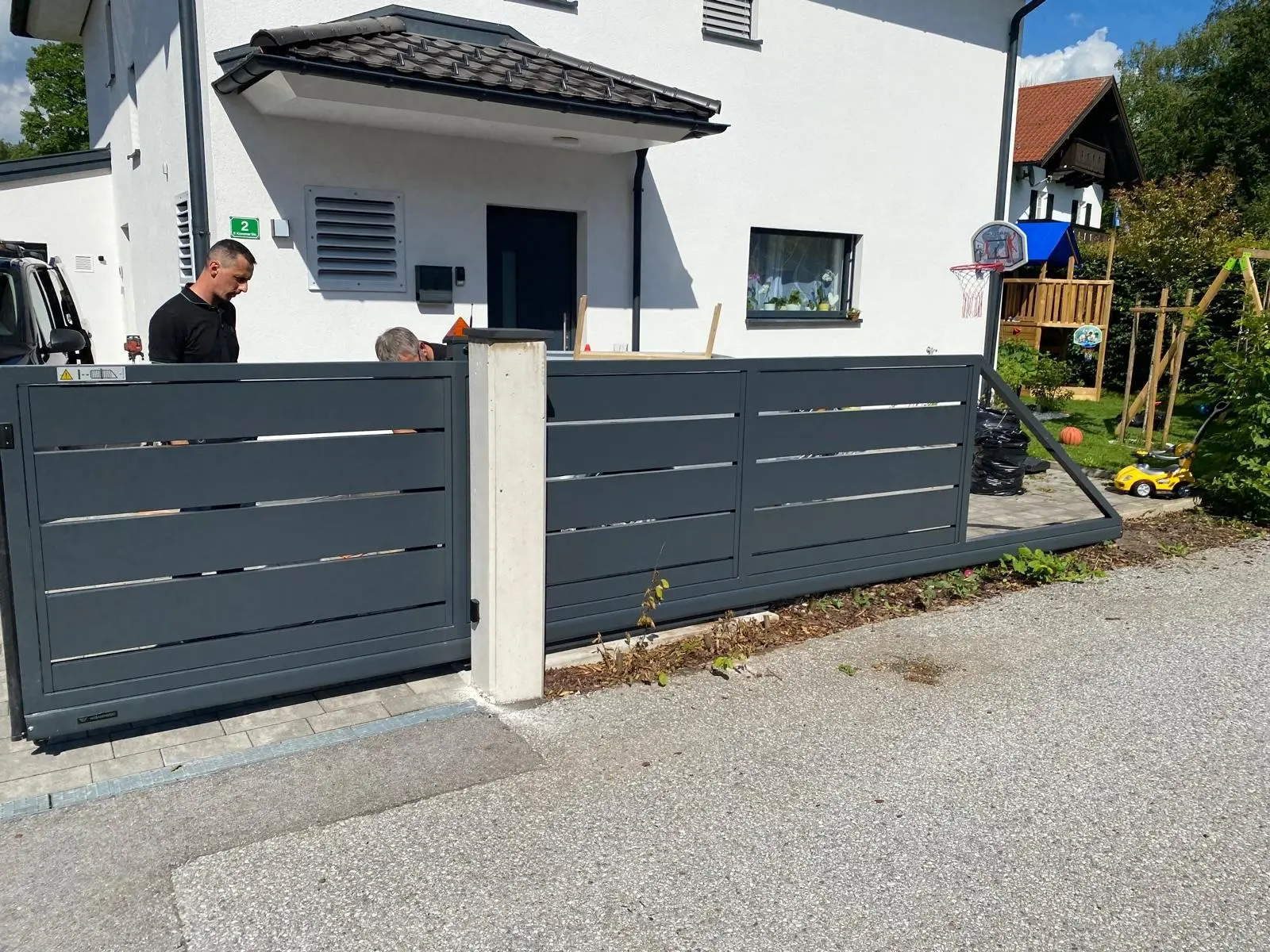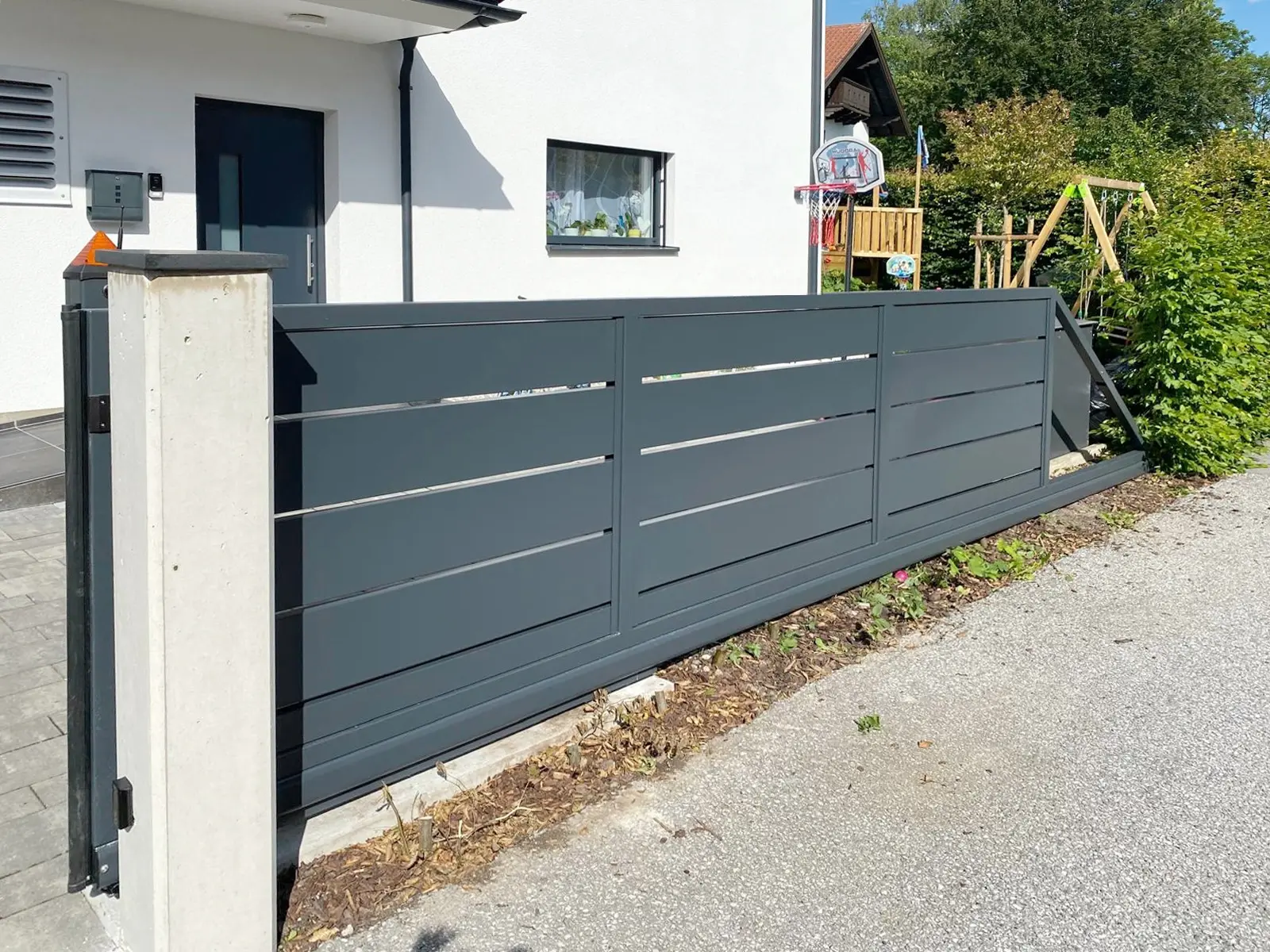 Wir waren von Anfang an an Ihrer Seite: vom ersten Gespräch über die individuelle Planung des Schiebetors bis zur passgenauen Fertigung. Unser Montageteam hat mit großer Sorgfalt dafür gesorgt, dass das Tor perfekt sitzt – sauber eingebaut, stabil verankert und optimal eingestellt. Ansichtsgleich passen alle Komponenten ineinander. Die zusätzliche Drehtür ermöglicht das Ein-und Ausgehen ohne das Schiebetor öffnen zu müssen, während die Multibox den Empfang mit eingebauter Gegensprechanlage übernimmt.