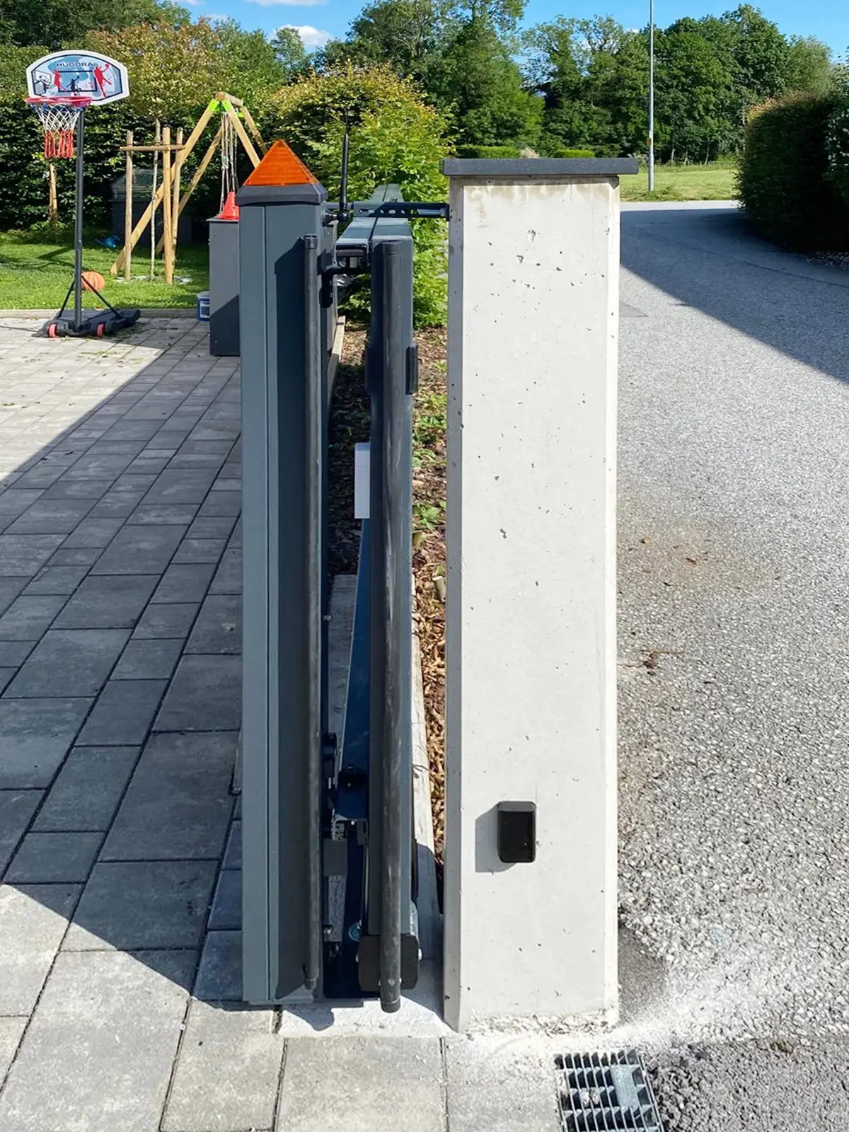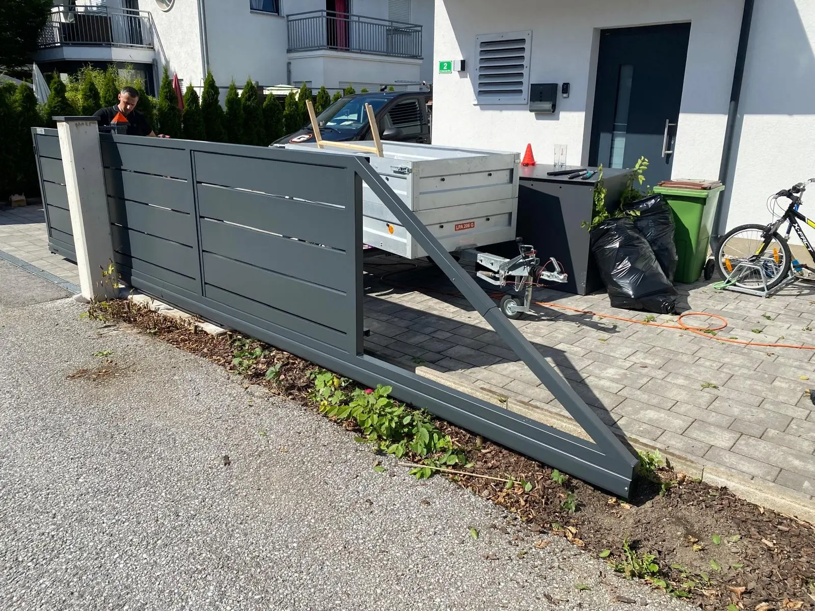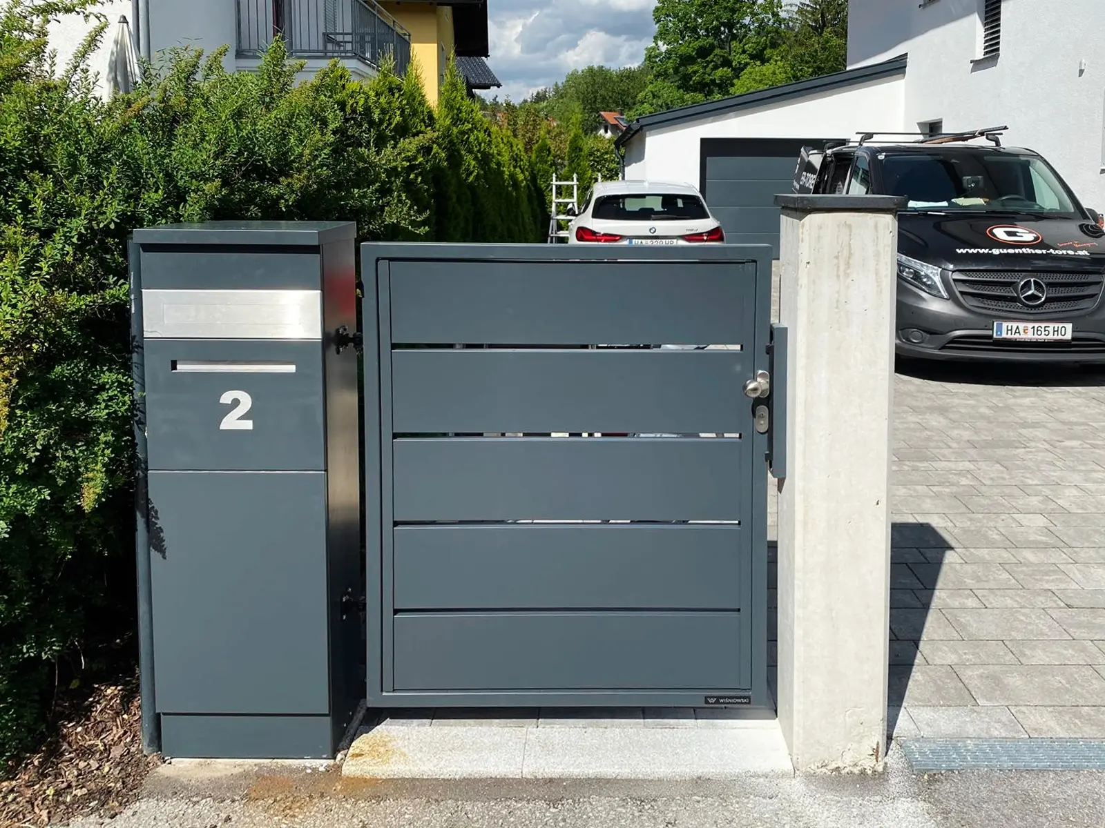 Wir waren von Anfang an an Ihrer Seite: vom ersten Gespräch über die individuelle Planung des Schiebetors bis zur passgenauen Fertigung. Unser Montageteam hat mit großer Sorgfalt dafür gesorgt, dass das Tor perfekt sitzt – sauber eingebaut, stabil verankert und optimal eingestellt. Ansichtsgleich passen alle Komponenten ineinander. Die zusätzliche Drehtür ermöglicht das Ein-und Ausgehen ohne das Schiebetor öffnen zu müssen, während die Multibox den Empfang mit eingebauter Gegensprechanlage übernimmt.